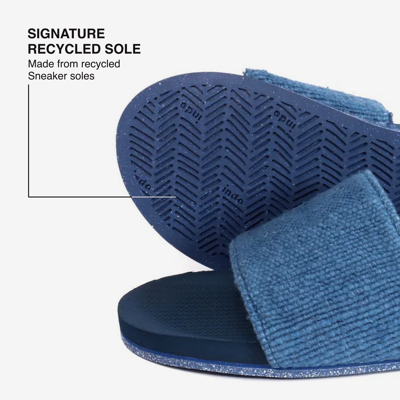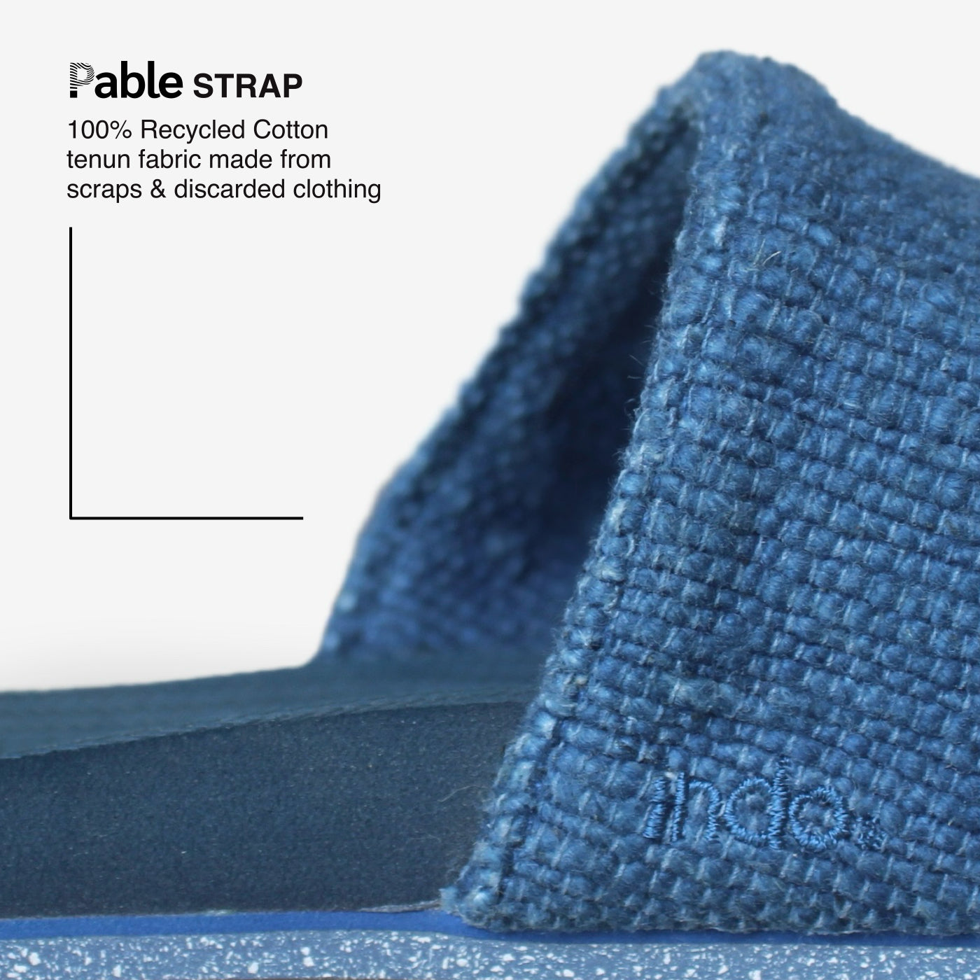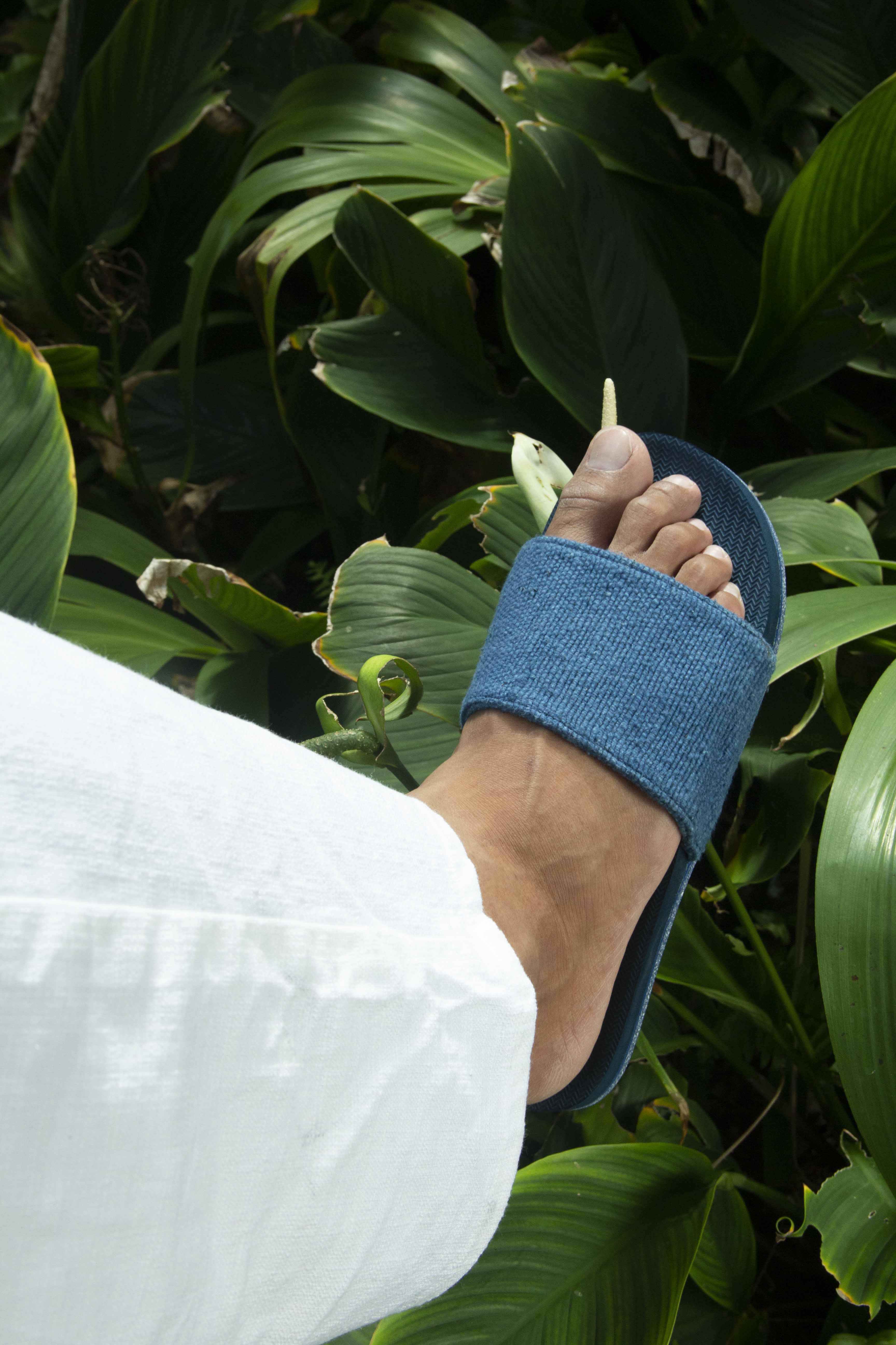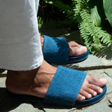 The Men’s Pable Slide – Indigo Shore brings a fresh, responsible twist to Indosole’s classic slide silhouette. This special edition pairs our durable recycled tire soles with 100% recycled textile straps created in collaboration with Pable, an Indonesian innovator turning fashion industry waste into regenerated, high-quality materials.